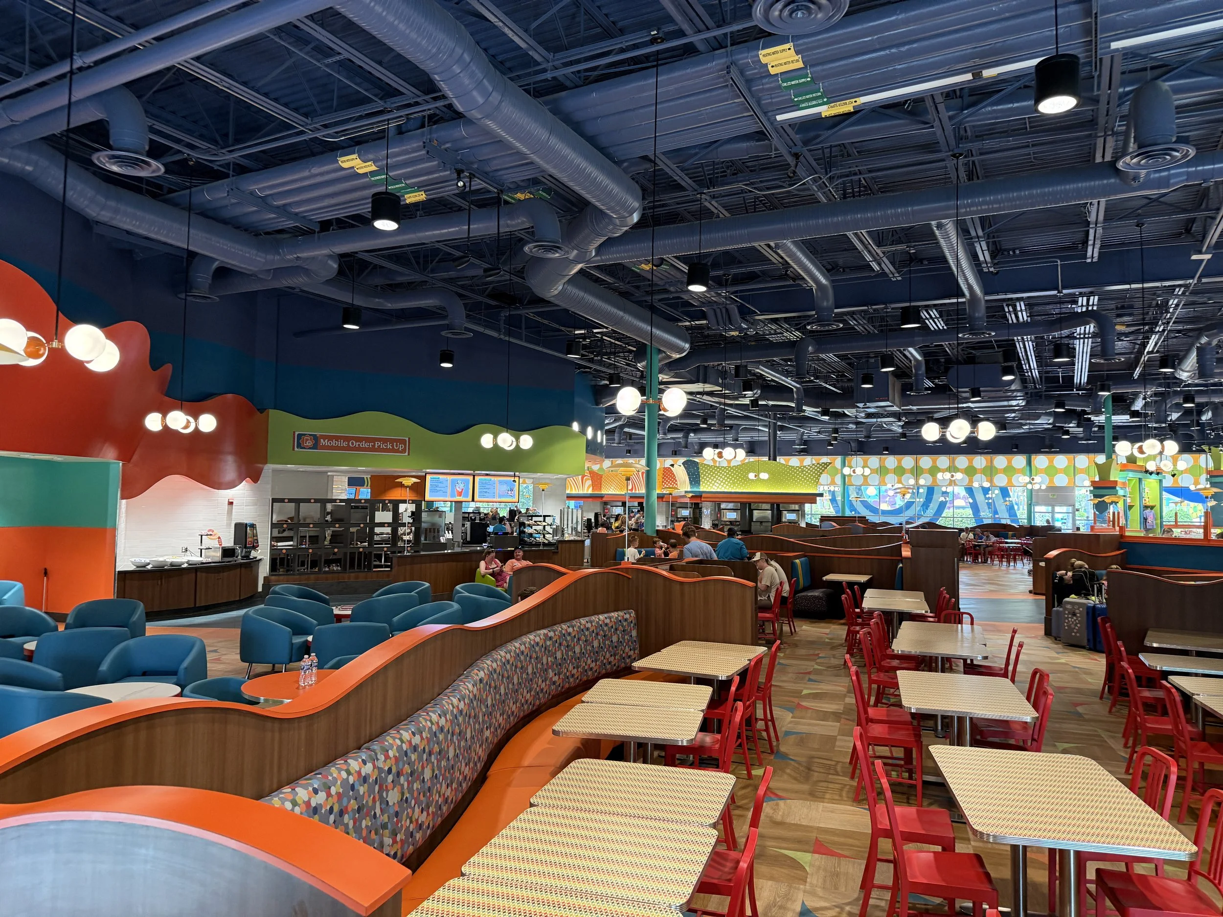 Everything Pop! is the name of shopping & dining area at Pop Century. This area was recently renovated in 2025, and they did a fantastic job. The retro color scheme reminds me of old TV ads (think 1970s Sesame Street mixed with 1960s Formica tables….ok, I’m not explaining it well, but I swear it works). I feel like the entire space is much more cohesive than it was in the past, and more thoughtfully designed. Now, the tables match the walls, which in turn match the booths.