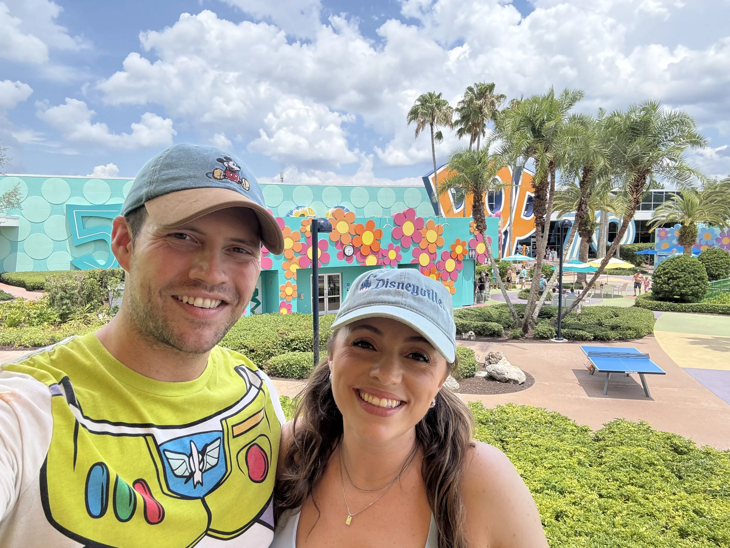 Now let’s discuss room location. Up until recently, we’ve always stayed in a Standard Room, and it’s been great. However, on our most recent stay, we opted instead for a Preferred Room. WE CANNOT RECOMMEND IT ENOUGH!!! I honestly don’t know that I see us going back to a Standard Room if given both options in the future. It was just so convenient to get to all the main areas of the resort. Our room, specifically, was in the 60s area. These buildings surround the main pool. This means they’re closest to lobby (and therefore closest to the park busses) and closest to the Skyliner. Trust me, after walking 15,000 steps in the parks, it was nice being able get off the Skyliner at the end of the day and know our room was right down the walkway. We were in room 4211, BLDG 4, Floor 2, if anyone is curious. The rooms in the 80s & 90s sections are the furthest away from the main lobby. We did these a few years ago when we stayed at Pop Century on my 29th birthday. They were totally fine, but definitely a further walk. However, one benefit of going with these rooms is that they tend to be quieter in general. Just something to keep in mind. Some rooms also have a view of Hourglass Lake, which is nice!