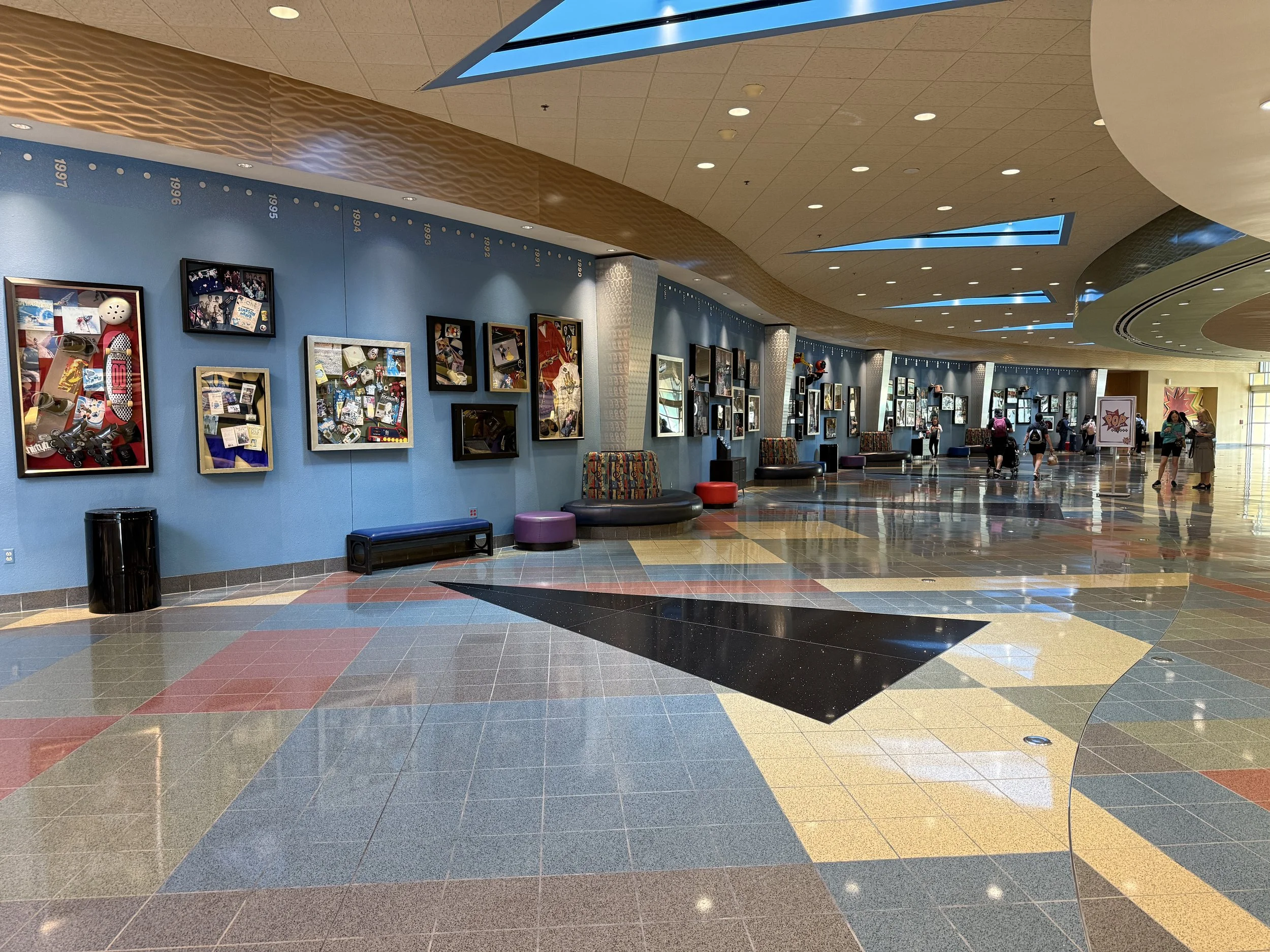 The lobby of Disney's Pop Century Resort! Note the shadow boxes on the wall and the sparkly floors!