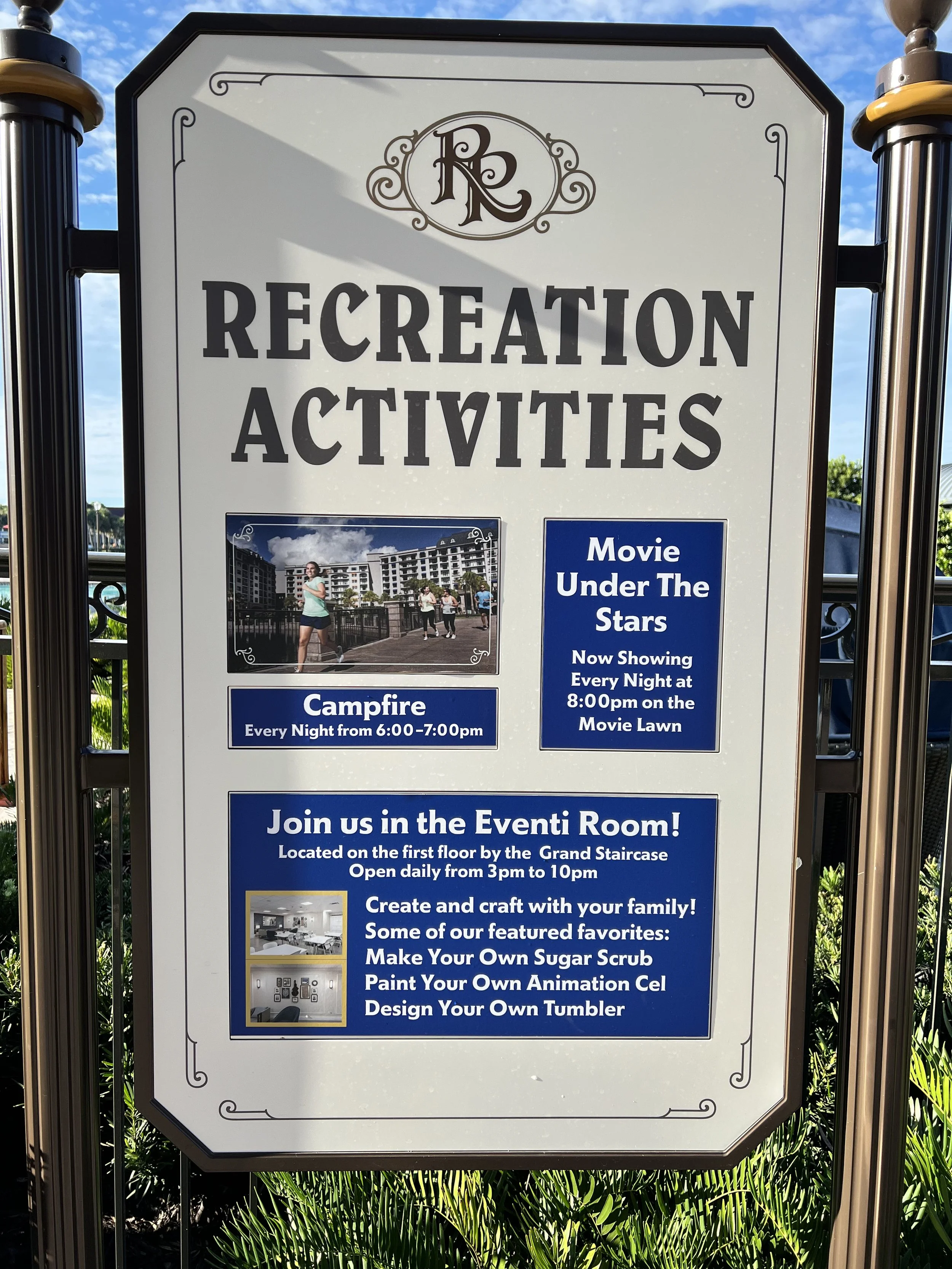 Movie-under-the-stars and marshmallow campfire time - All Disney resorts offer these throughout the week. There is usually a large sign outside/near the main lobby with movies, times, and location. Totally free - the only thing you’d have to pay for is a s’mores kit with graham crackers & chocolate if you wanted one. (The marshmallow roasting part is free!)